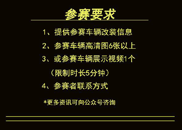3、參賽改裝車高清大圖6張以上,或5分鐘以內(nèi)視頻1個