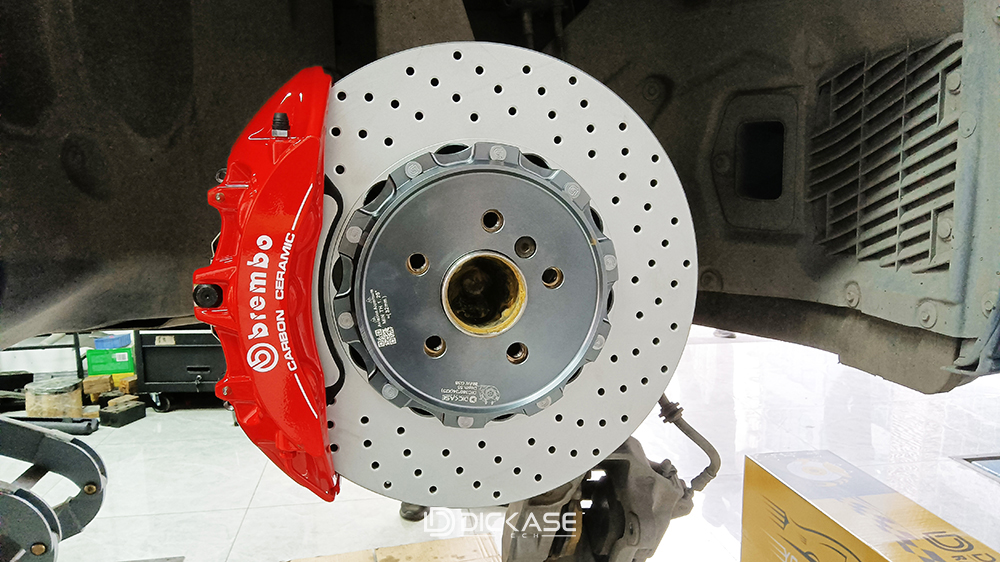 這里車主選用的是Brembo v6大六活塞卡鉗搭配DICASE打孔剎車盤,hp1000街道版剎車片,這樣的配置有一個(gè)很好的優(yōu)點(diǎn)就是輕踩線性平穩(wěn),重踩制動(dòng)力十足,更偏向于家庭一些。